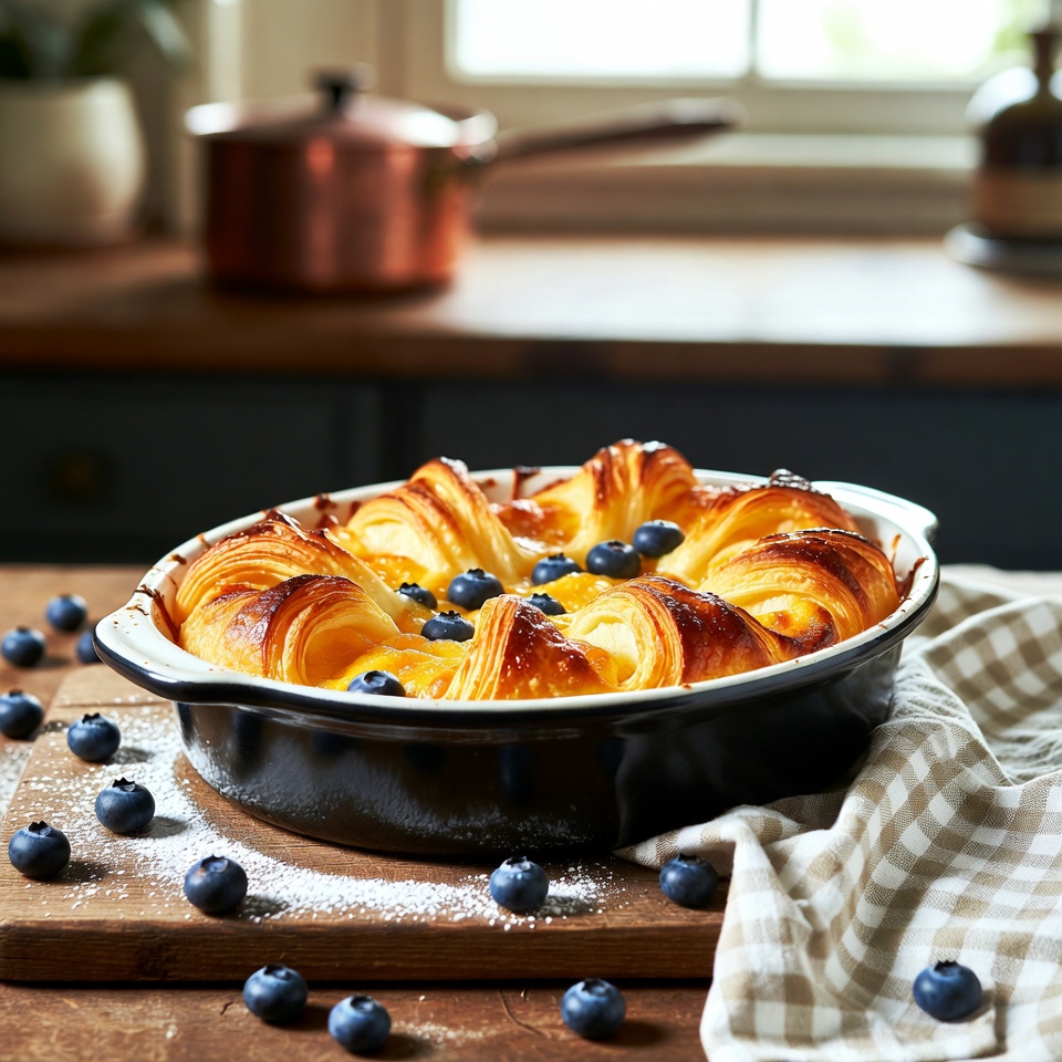 Cette casserole gourmande associe une pâte feuilletée de type croissant, une garniture onctueuse au fromage frais et une touche parfumée de cannelle. Facile à préparer, elle séduit par son contraste entre le croustillant de la pâte et le fondant de la crème.