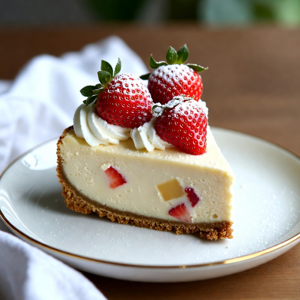 Un délicieux cheesecake aux fraises et chocolat blanc, avec une base croquante au biscuit et une garniture onctueuse, parfait pour 8 personnes.