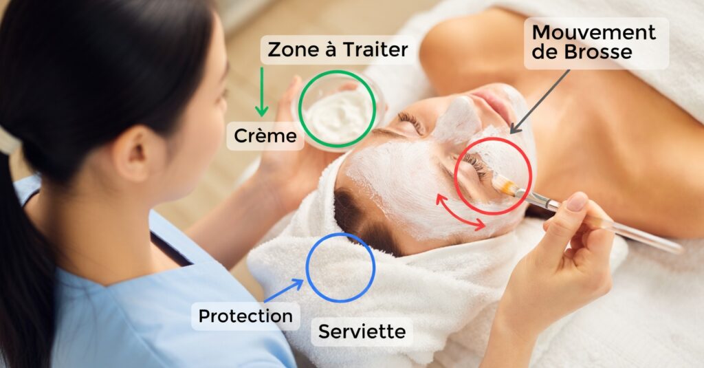 - Applique une fine couche uniforme sur le visage en évitant :