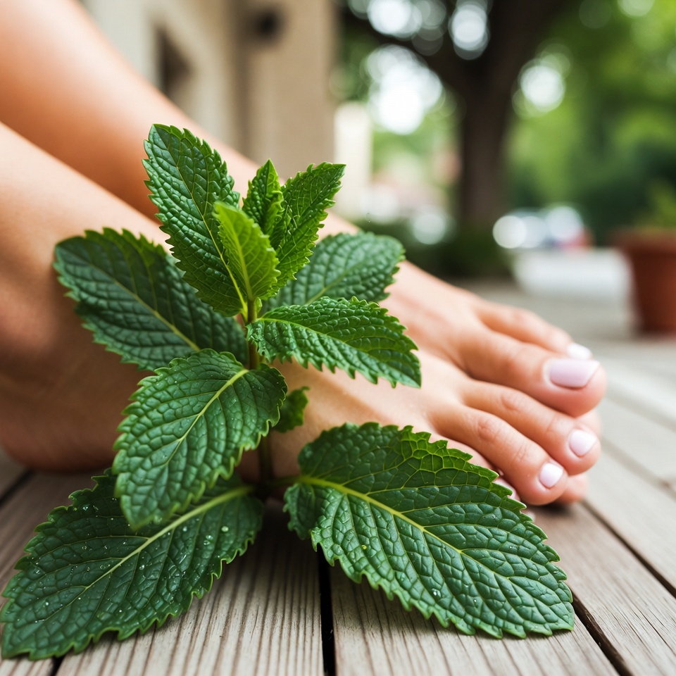 Les feuilles de menthe renferment du menthol, un composé connu pour ses effets analgésiques naturels, c’est‑à‑dire qu’il aide à atténuer la douleur. Utilisée directement sur les pieds, la menthe peut apaiser les muscles fatigués et réduire les sensations de gêne ou de lourdeur.