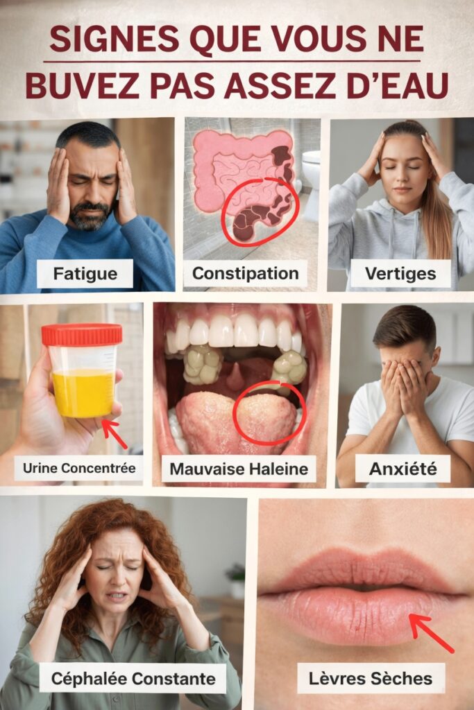 Voici quelques-uns des indicateurs les plus courants suggérant que vos réserves en eau sont trop basses. Leur intensité peut varier d’une personne à l’autre, mais ils reviennent régulièrement dans les observations médicales.